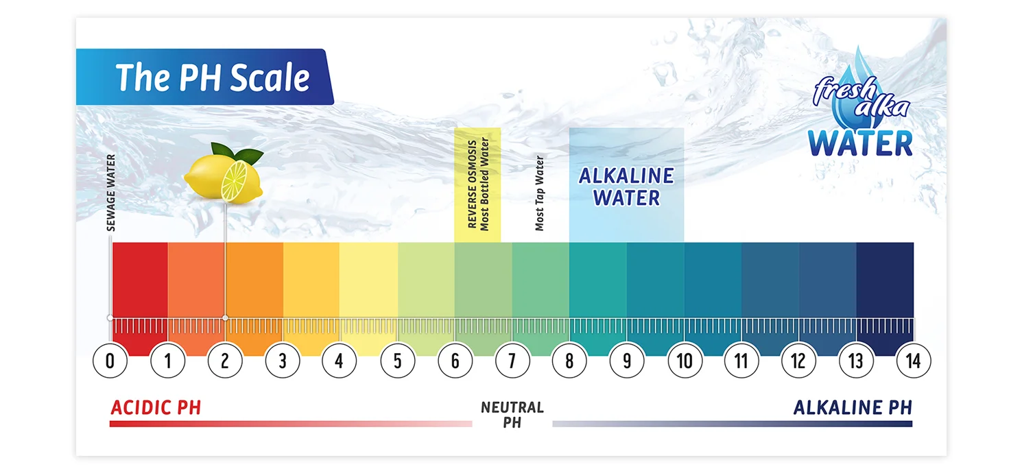Typically, the water you consume from store bought brands or from your home, measures low in pH levels. Tap water contains dissolved elements that affect the pH level in the water. The lower the pH level, the more acidic the water. Check out our chart below to visually compare the difference in pH levels.
